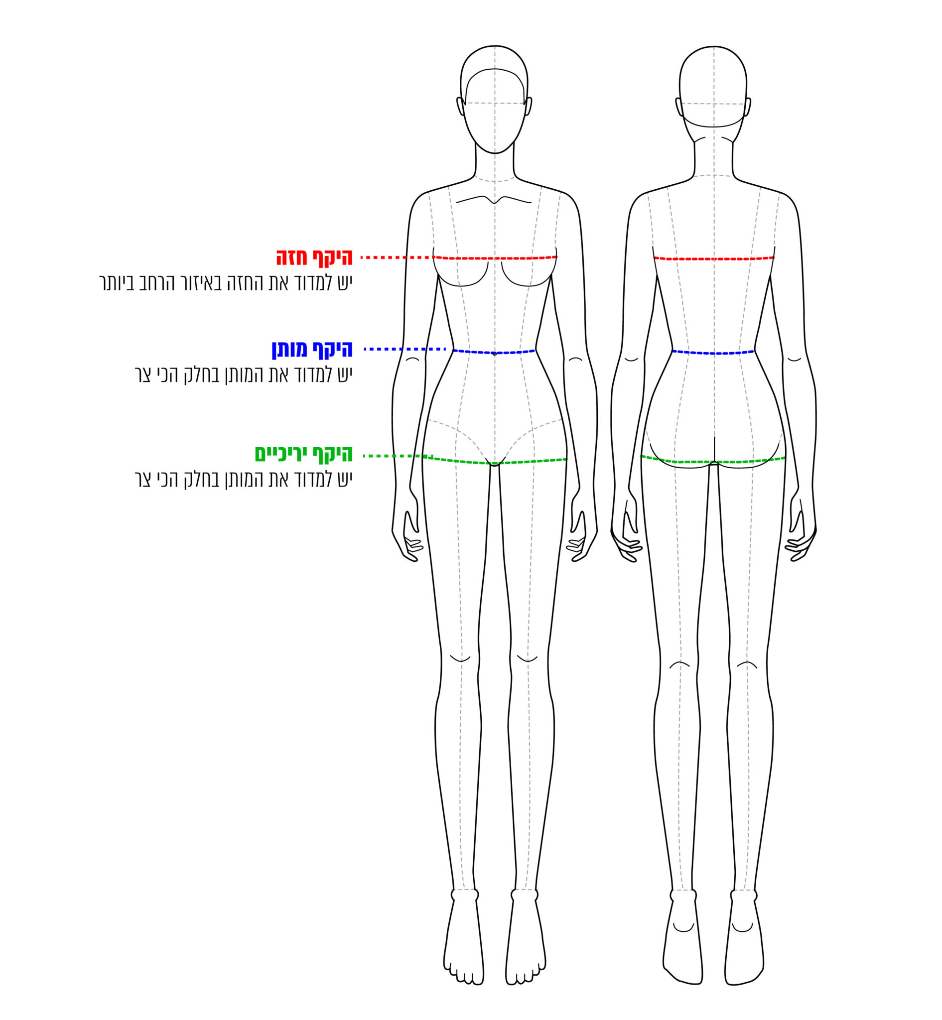 עלייך למדוד את היקף החזה, והמותניים וכך בקלות תוכלי לבחור את המידה המתאימה עבורך במדויק. למדידת ההיקפים היעזרי בסרט מידה