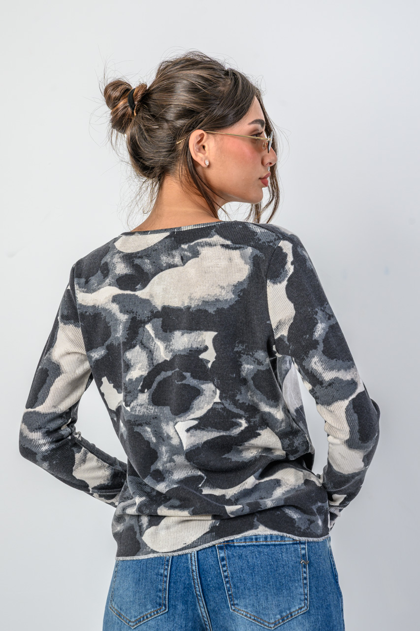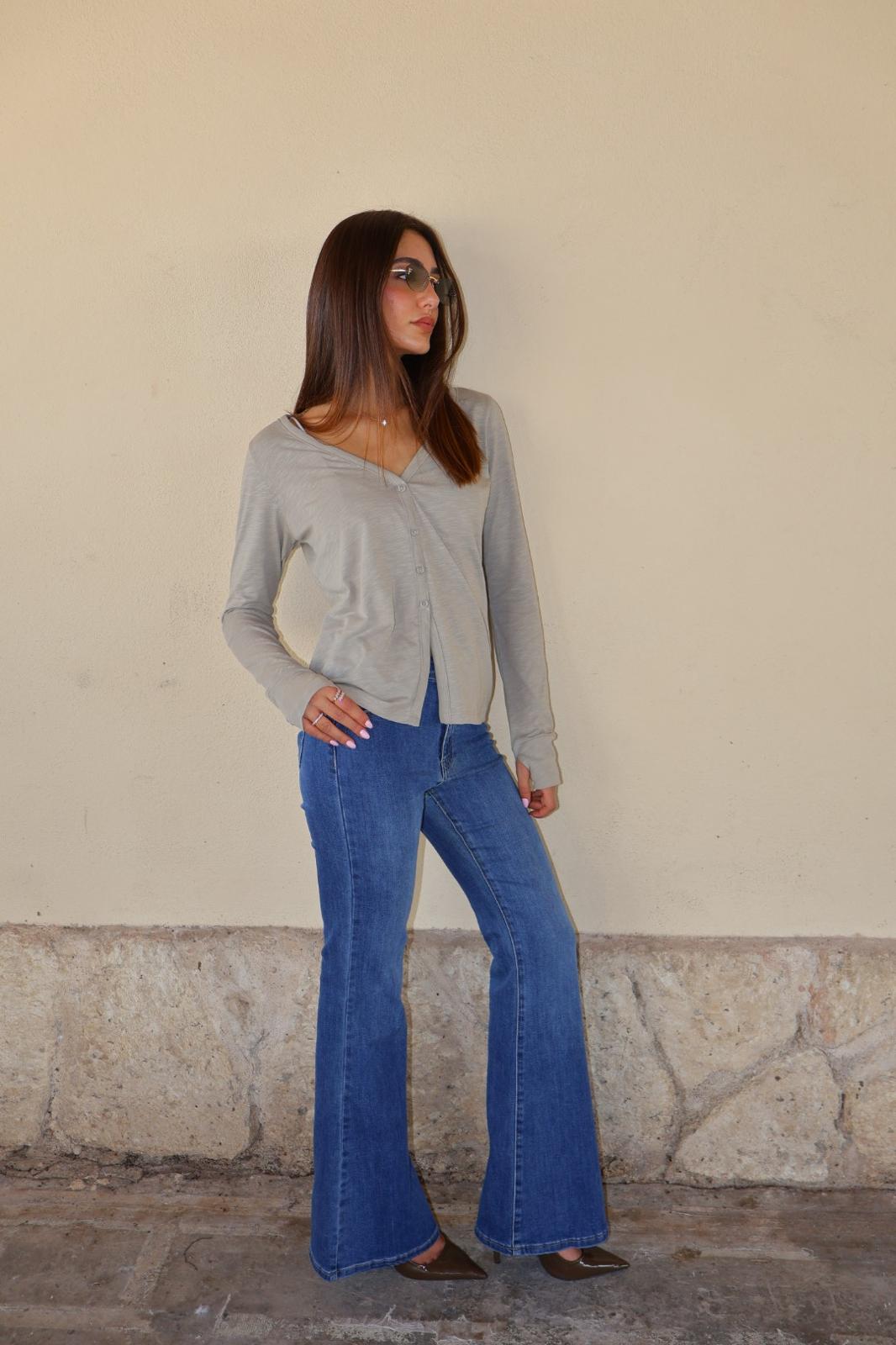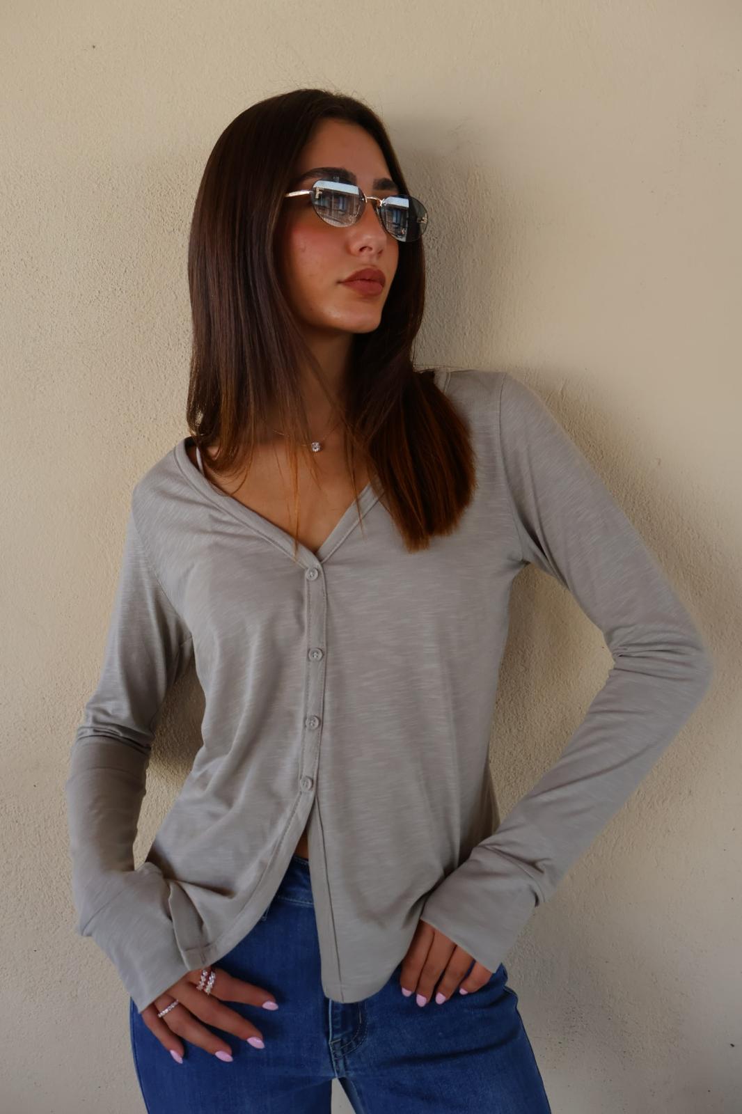 חולצה נעימה וקלילה עם כפתורים בגזרת וי צווארון נמוך ומחמיא, עם סגירת כפתורים עדינה לכל אורכה.