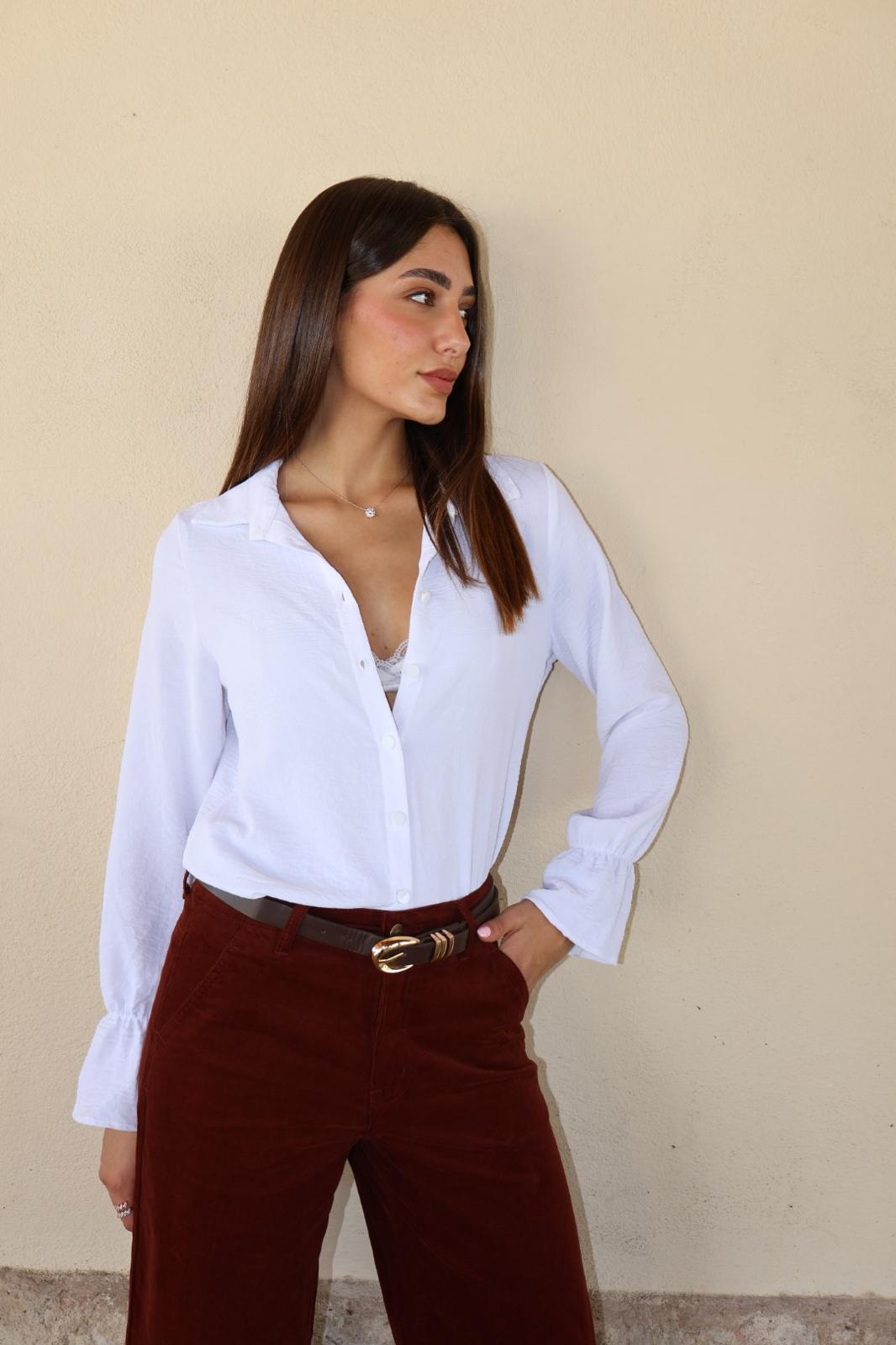 חולצה מכופתרת קלאסית עם שרוול ארוך, בגוונים לבן/חום/שחור. החולצה עשויה מבד נעים, קליל ודק.