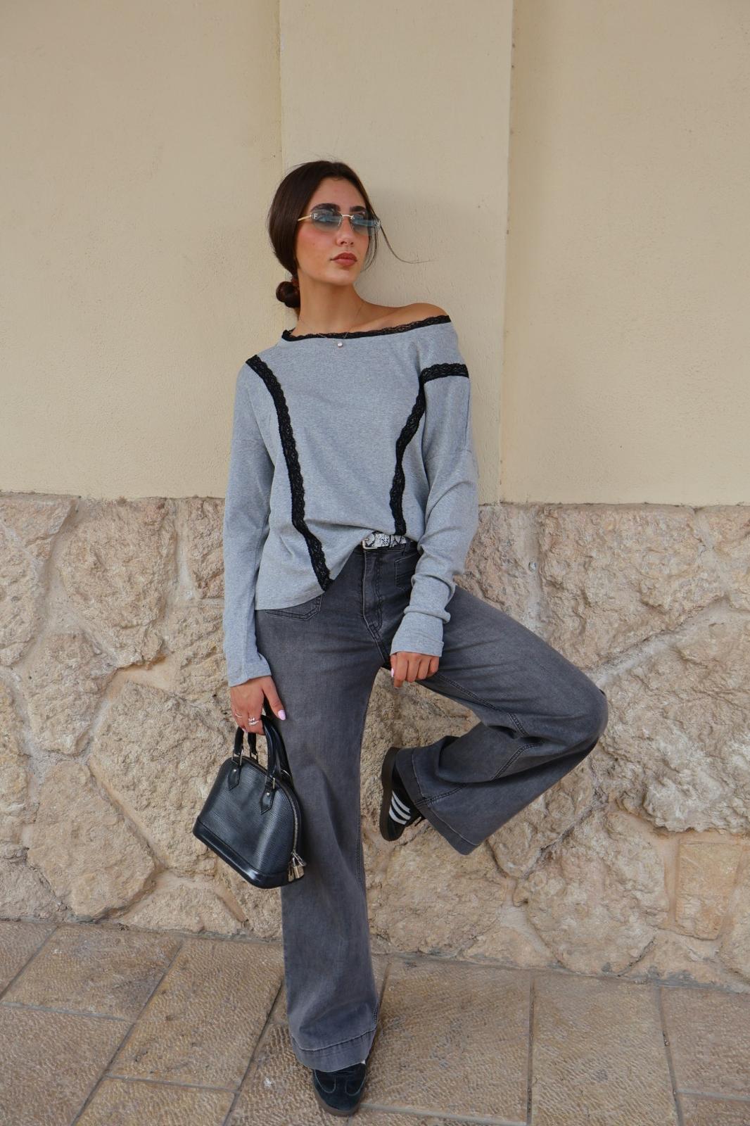 חולצת בסיס אופנתית מבד כותנה נעים. החולצה משלבת מראה קלאסי עם נגיעה ייחודית של עיטורי תחרה שחורה עדינה התפורים באלכסון בחזית ויוצרים עניין ויזואלי.