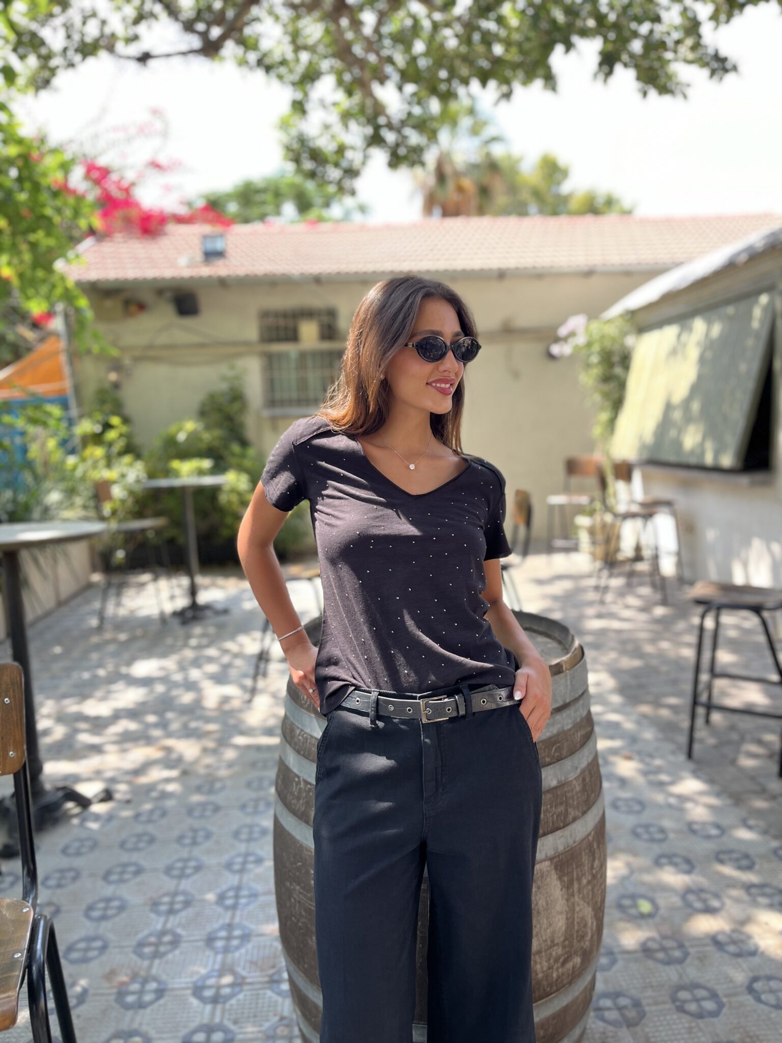 “טישירט וי שחורה עם נגיעות קריסטל – הסטייל שאת מחפשת!