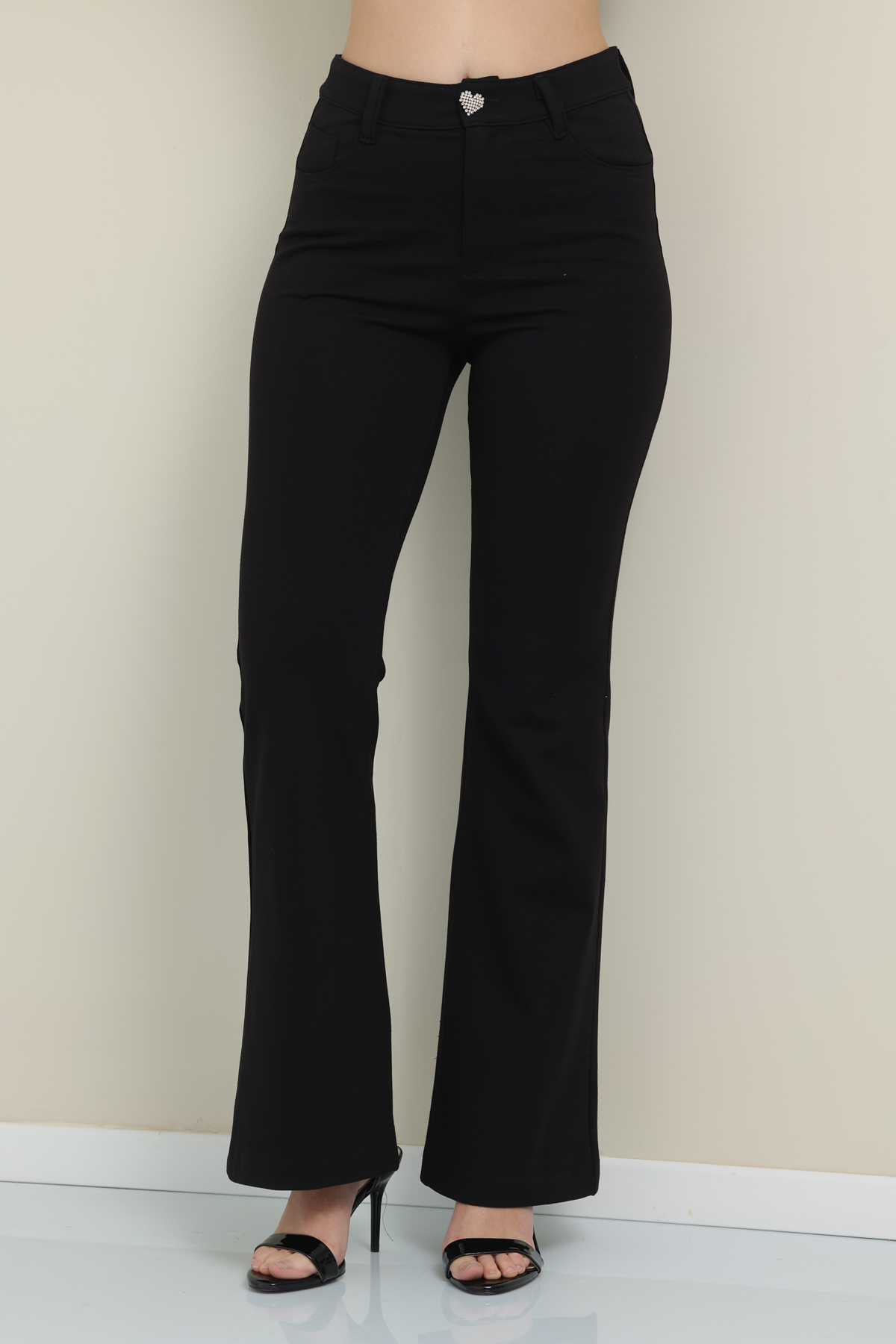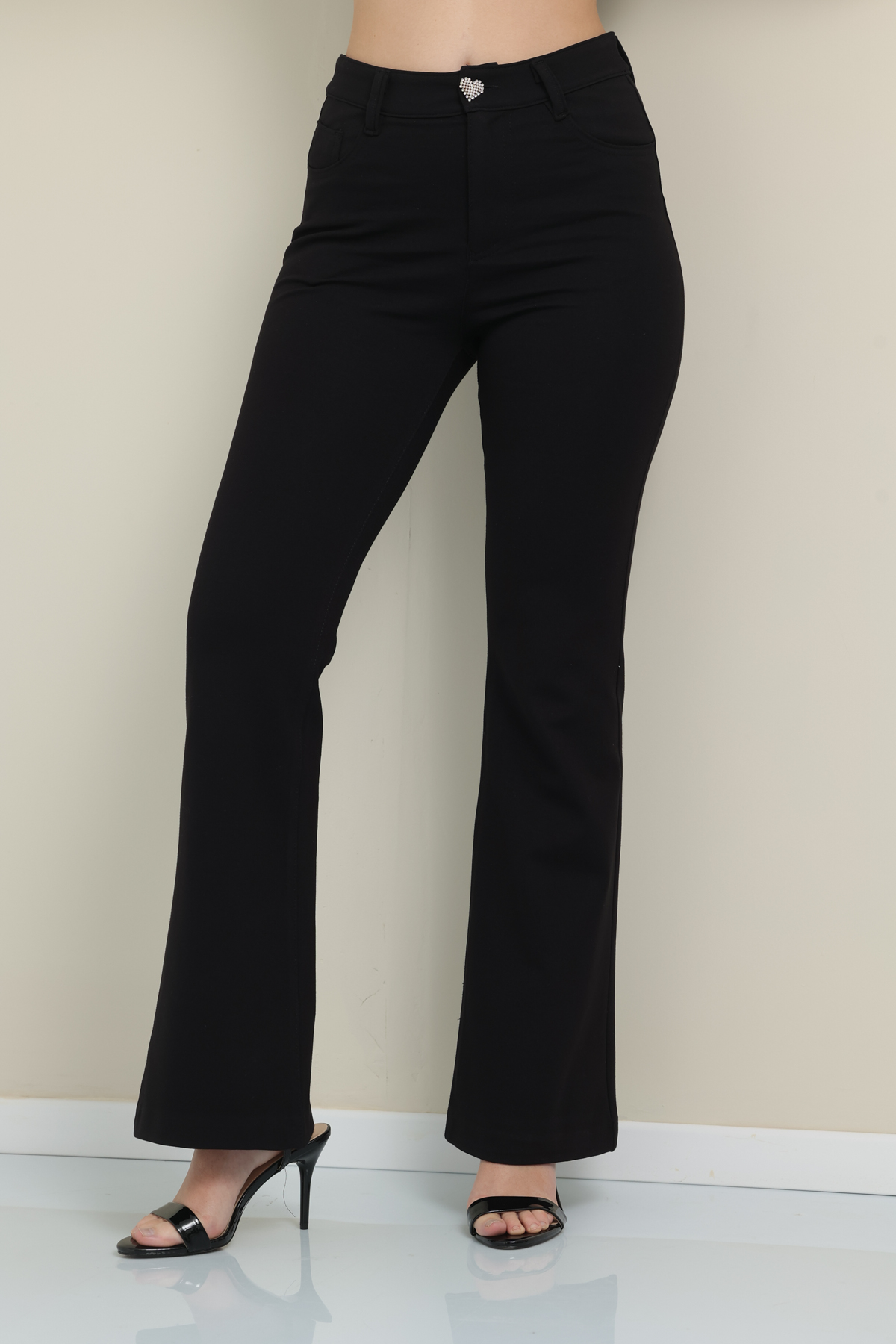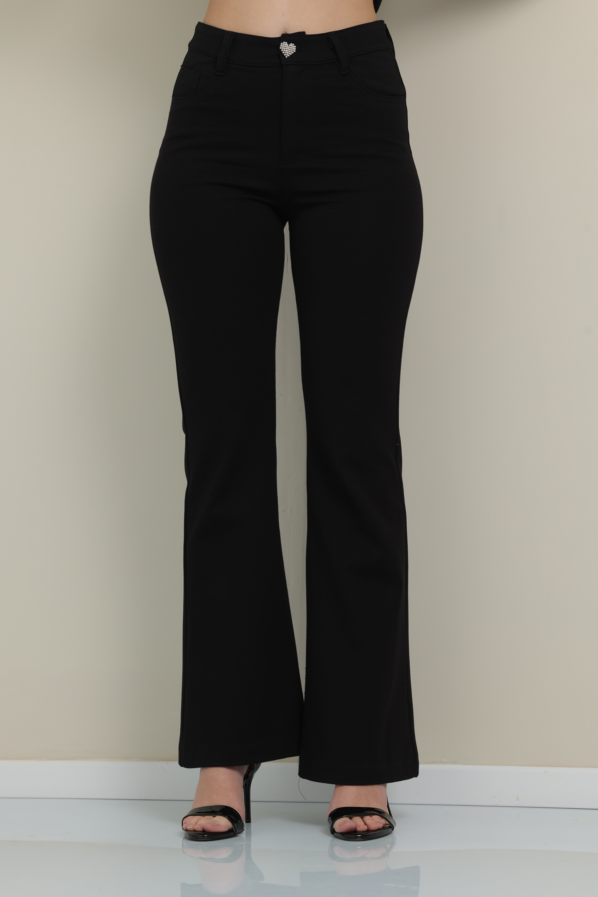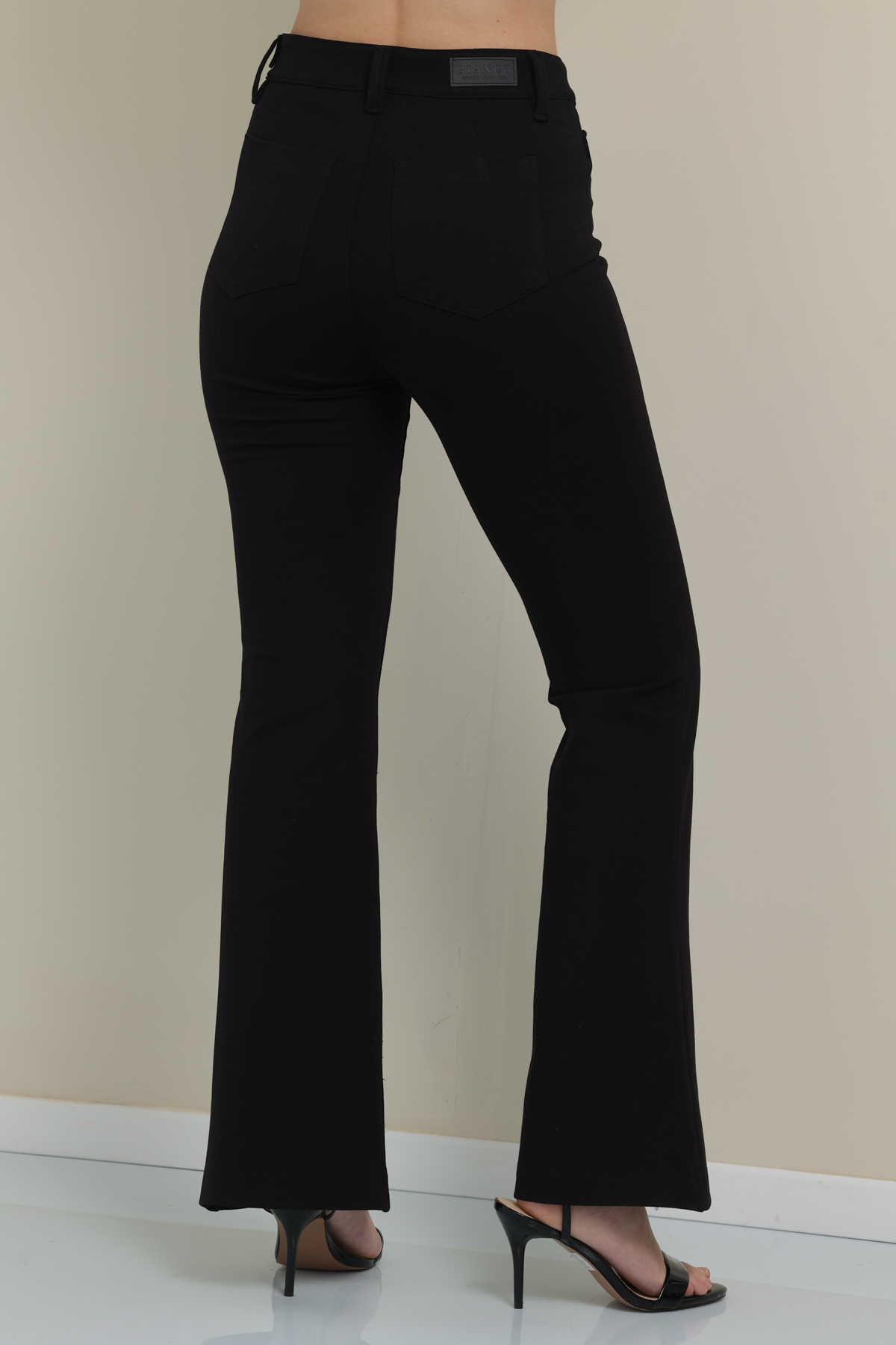 ג׳ינס בגזרה גבוה ומעט פלייר בסיומת.