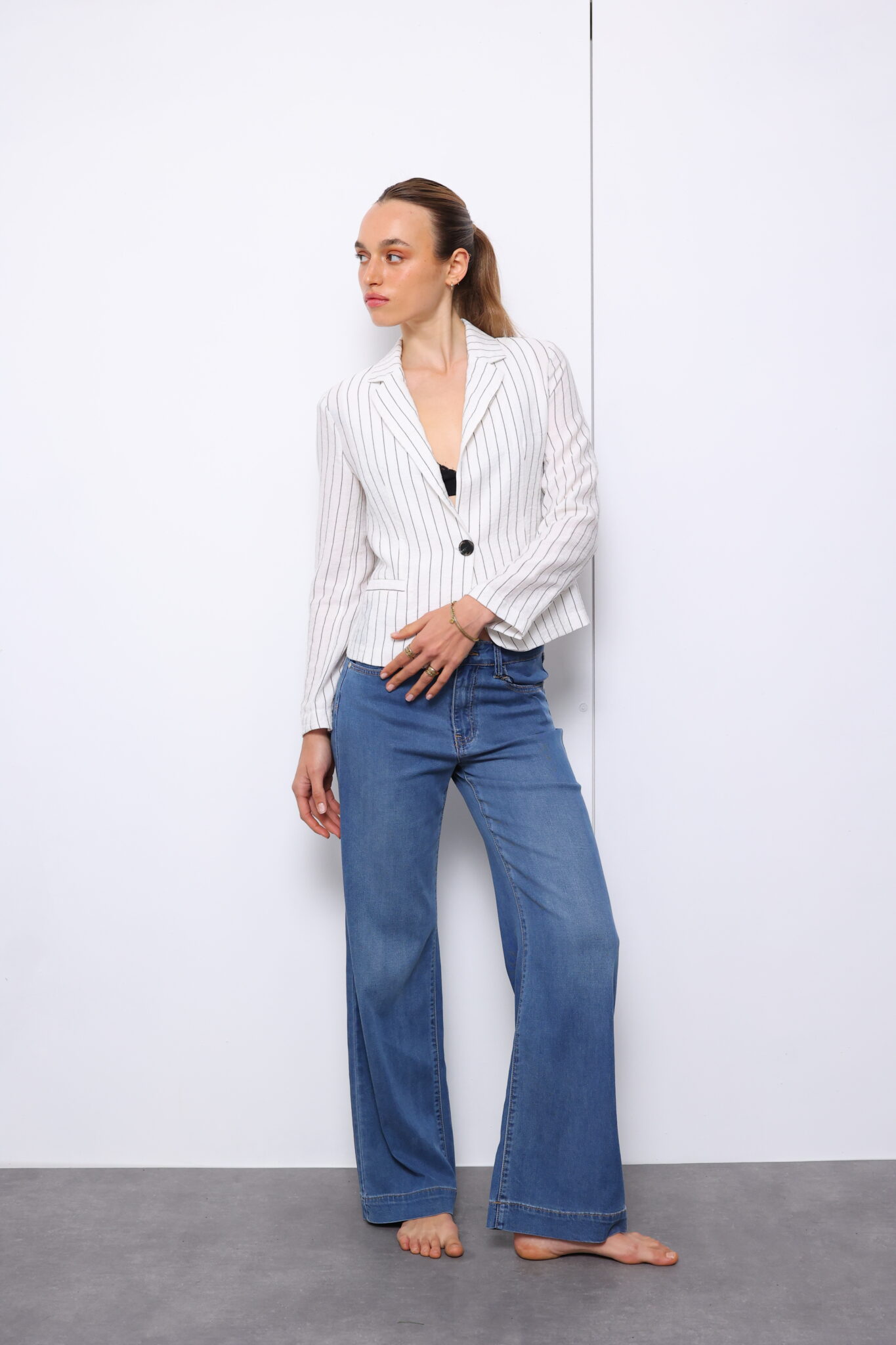 ג’ינס פלייר באורך ארוך ובגזרה סופר מחמיאה בבד סטרצ’י נוח ואוסף.
