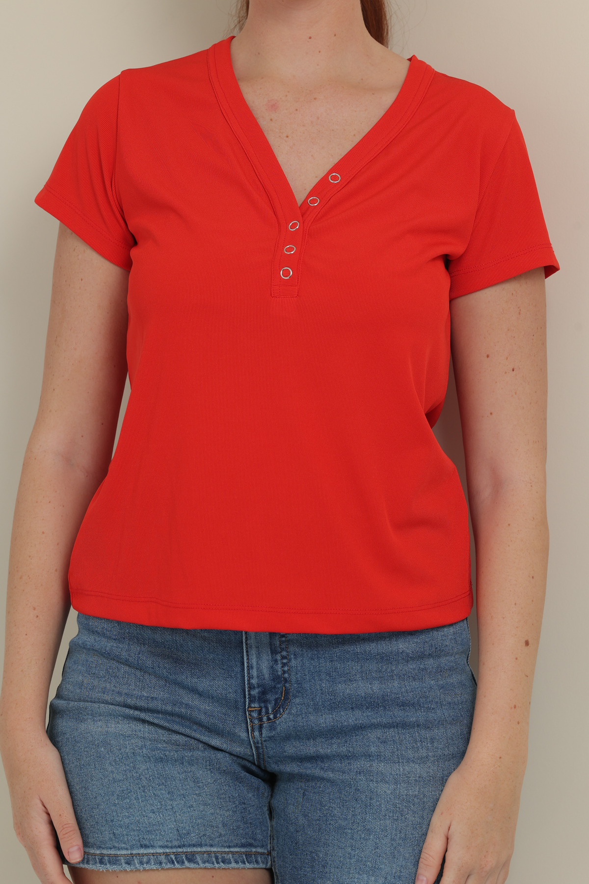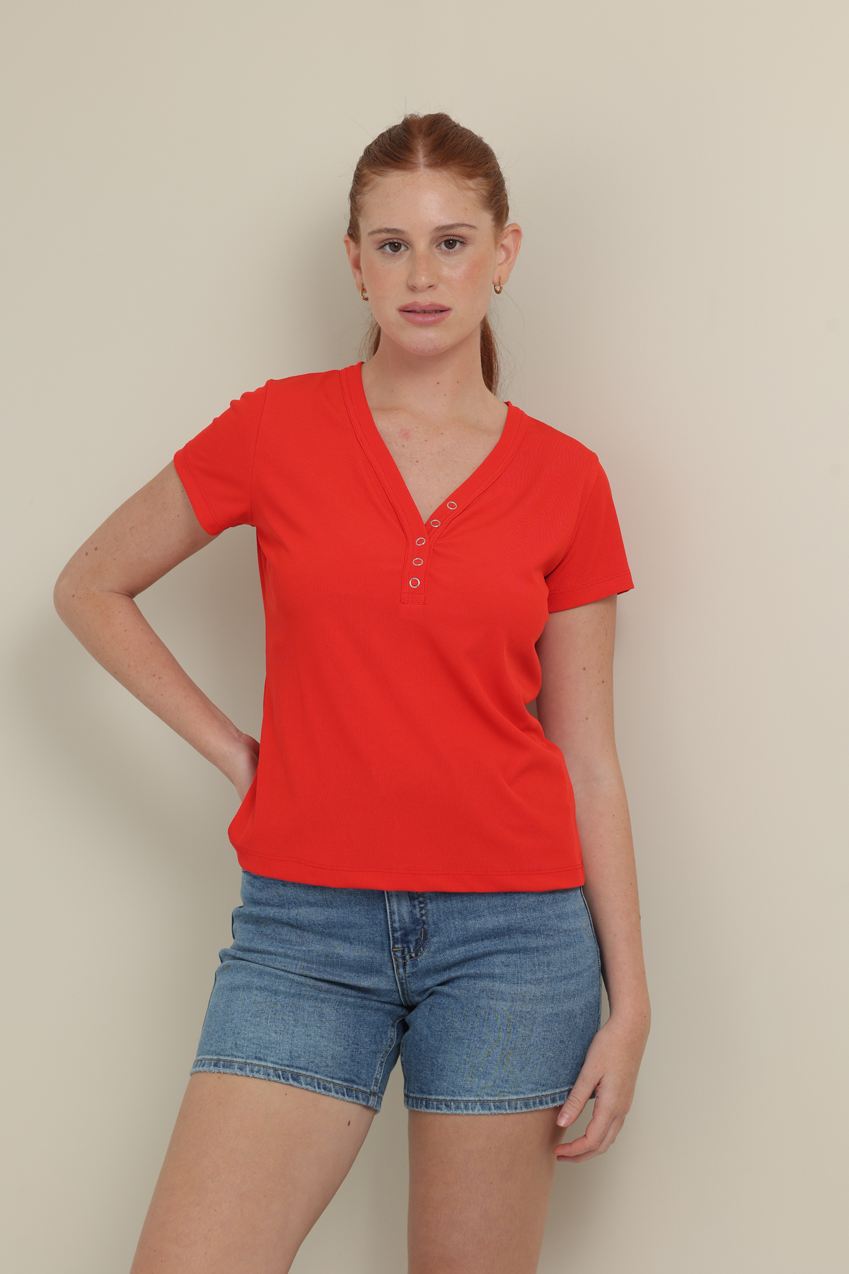 טי-שרט בייסיק ריב באורך מותן , בשילוב מחשוף כפתורים ושרוולים קצרים.