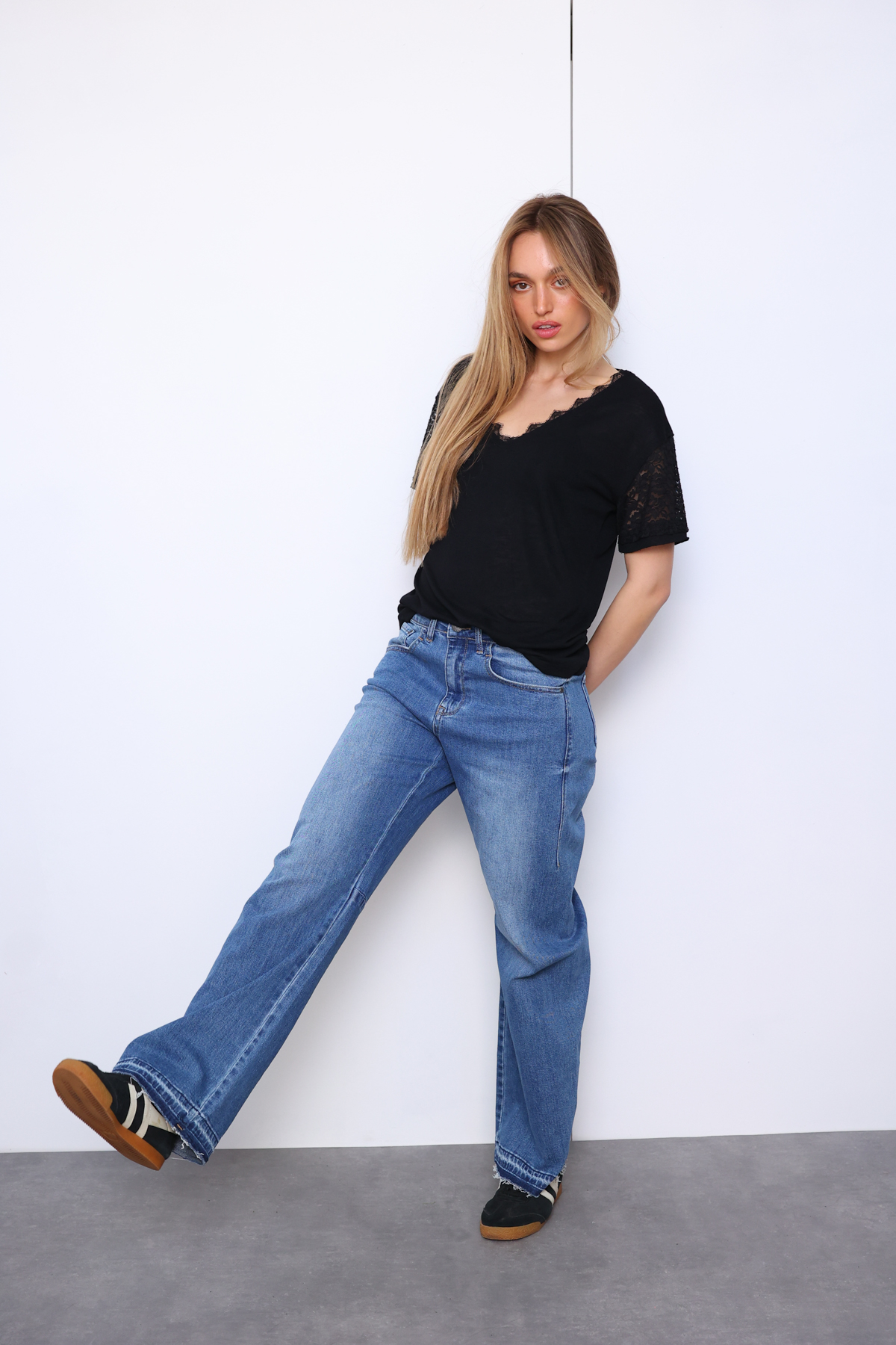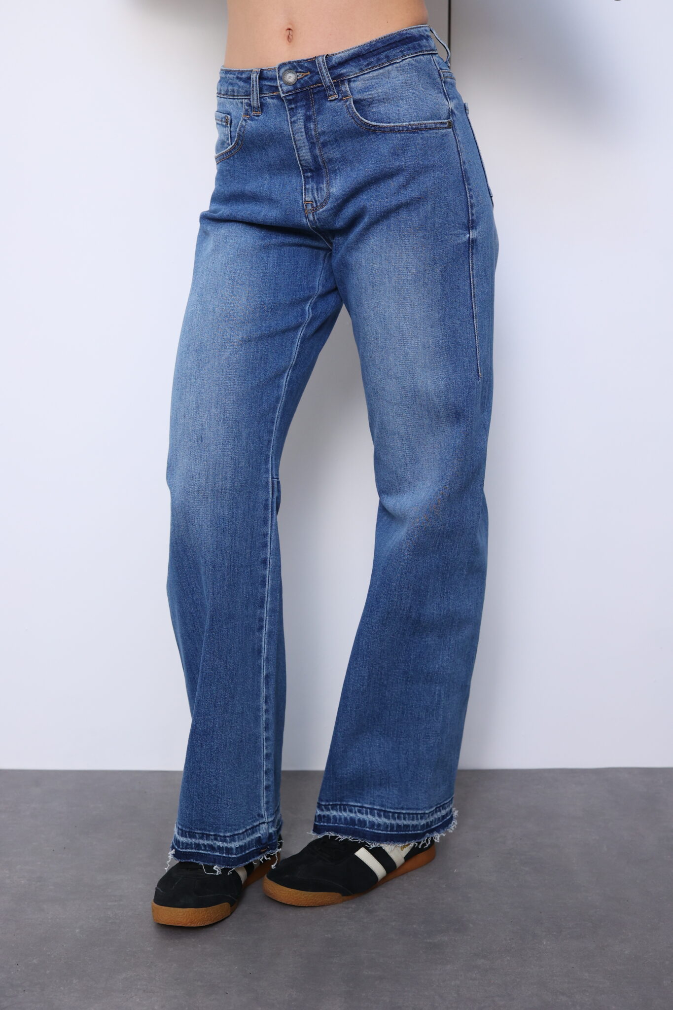 ג’ינס מאמס גבוה בגזרה ישרה ארוכה ומעט פלייר בסיומת מחמיאה במיוחד.