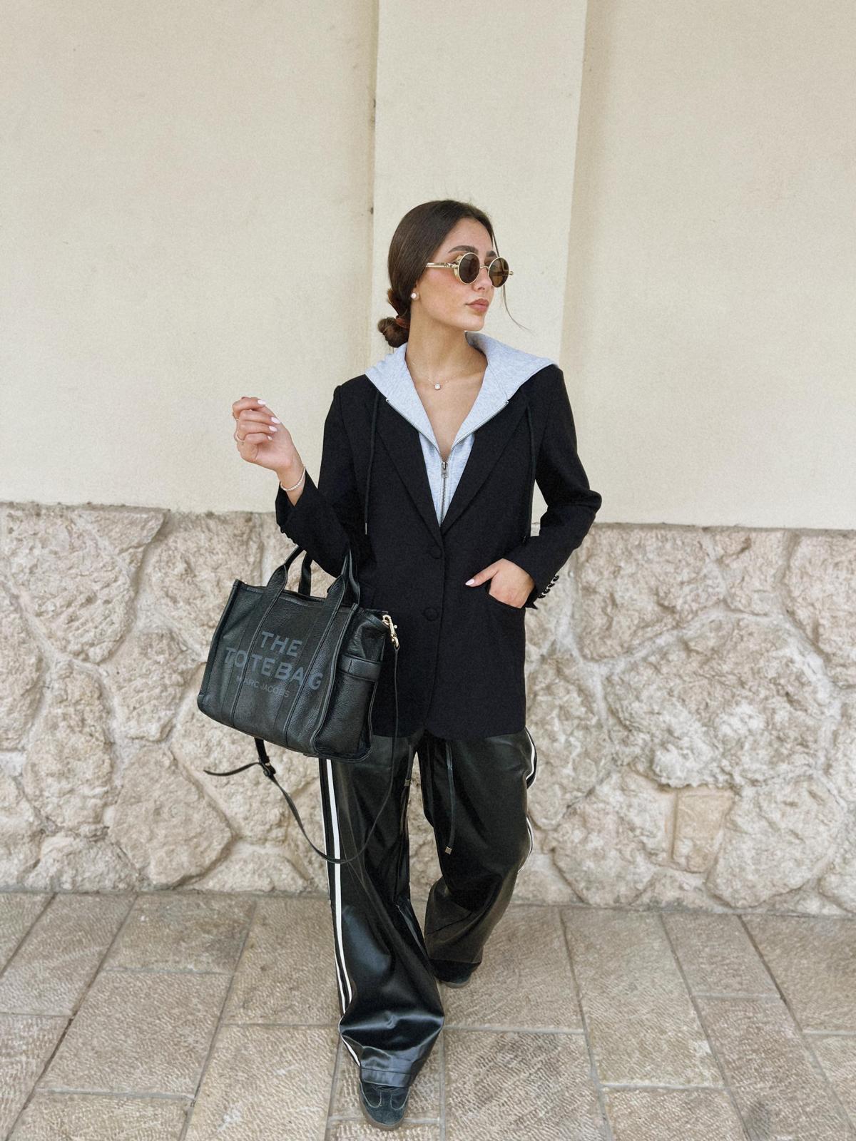 מכנס PU רחב (Wide Leg) ואופנתי מבד דמוי עור שחור מבריק. המכנסיים מעוצבים עם פסים לבנים כפולים בצידי הרגל, המעניקים מראה ספורטיבי-שיקי ומאריכים את הגזרה. כוללים מותן עם שרוך לכוונון ונוחות מקסימלית. מושלמים ליצירת לוק אורבני טרנדי, יום או ערב.